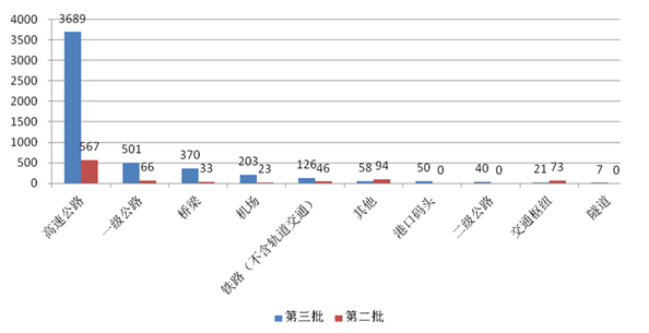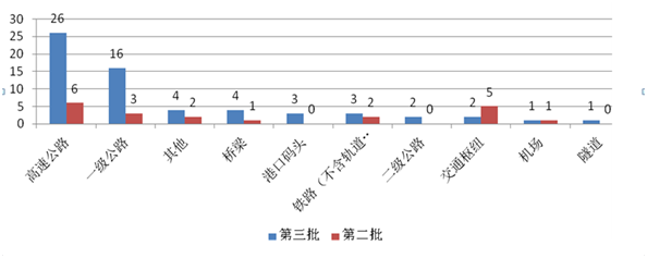 与第二批示范项目相比,新增项目42个,其中高速公路和一级公路两个二级行业新增项目较多,分别为20个和13个,占新增项目的78.6%;港口码头、二级公路和隧道类项目均实现“零的突破”,其中,港口码头类项目新增3个。从二级行业范围看,第三批示范项目覆盖范围得到进一步拓展。