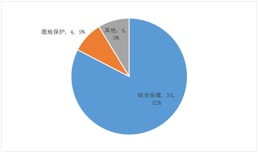 如图12所示,对应二级行业项目只有3类,分别是综合治理项目38个,占比82.6%;湿地保护项目4个,占比8.7%;其他项目4个,占比8.7%。投资总额分别为综合治理项目711.32亿,占比87.8%;其他项目59.14亿,占比7.3%、湿地保护项目40.1亿,占比4.9%。