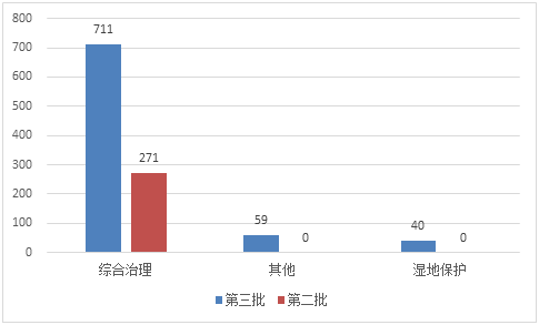 与第二批示范项目相比,新增项目33个,其中综合治理类项目增幅较大,湿地保护和其他两类为第三批新增二级行业类型;新增投资额539.4亿元。