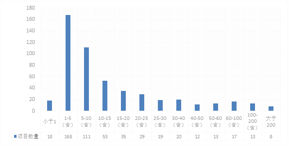 图1显示了本次示范项目投资规模分布情况,具体而言,1-5亿元区间的项目数量最多,为168个,5-10亿元区间的项目为111个,二者占比达54%;投资规模在1亿元以下的项目有18个,具体包括市政工程类12个、医疗卫生类2个、科技类2个、生态建设与环境保护类1个、养老类1个;100亿元以上的项目有21个,具体包括交通运输类15个、市政工程类4个(全部为轨道交通)、城镇综合开发类1个、生态建设与环境保护类1个。从项目规模上看,本次示范项目体现出两个特点:一是以中小型项目为主,这类项目进入的门槛较低,更能吸引民营资本参与;二是大型项目主要集中在交通领域,这类项目投资额巨大,也一直是较为成熟的PPP模式适用领域。