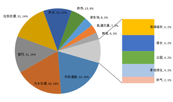 如图6所示,对应二级行业项目数量前5位分别是市政道路项目43个,占比19%;污水处理项目40个,占比18%;管网项目31个,占比14%;垃圾处理项目31个,占比14%;供水项目24个,占比11%。前5位项目总数占比76%。