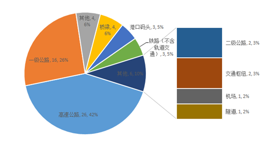 如图9所示,对应二级行业项目数量前5位分别是高速公路项目26个,占比42%;一级公路项目16个,占比26%;桥梁和其他类项目各4个,各占比6%;铁路项目(不含轨道交通)和港口码头项目各3个,各占比5%。前5位项目总数占比90%。